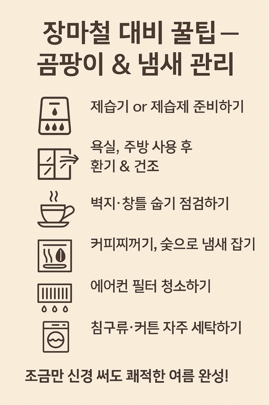 장마철엔 습도가 높아져 곰팡이와 꿉꿉한 냄새가 쉽게 생겨요.