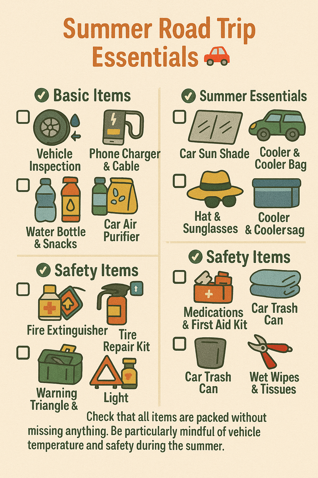 🌿 모든 준비물이 빠짐없이 챙겨졌는지 체크하세요. 여름철에는 특히 차량 내부 온도와 안전에 유의하며 여행을 즐기세요.